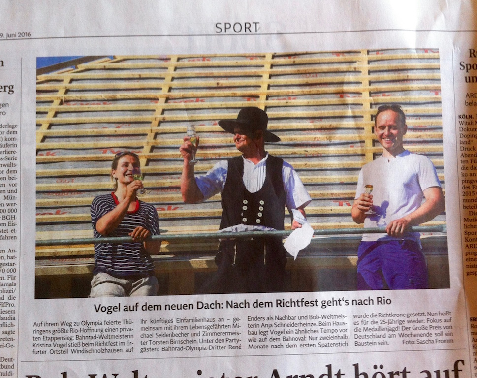 Mit sehr vielen Gästen feierten die Olympiasiegerin Kristina Vogel und Michael Seidenbecher ihr Richtfest. Die Stimmung war sehr gut und für viele Freunde die letzte Möglichkeit Kristina persönlich für die Olympischen Spiele in Rio alles Gute zu wünschen. Wir schließen uns den Glückwünschen an und drücken an den Wettkampftagen ganz fest die Daumen.